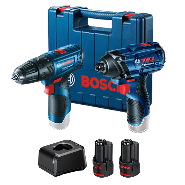 The Bosch 12V Combo includes 1 GDR 120-LI Impact Wrench + 1 GSB 120-LI Impact Drill/Driver, with 2 x 2.0Ah batteries and 1 x 110V fast charger. It also comes with a reinforced carrying case for transporting your tools. Furthermore, the tools are compatible with all Bosch 12V batteries and chargers.