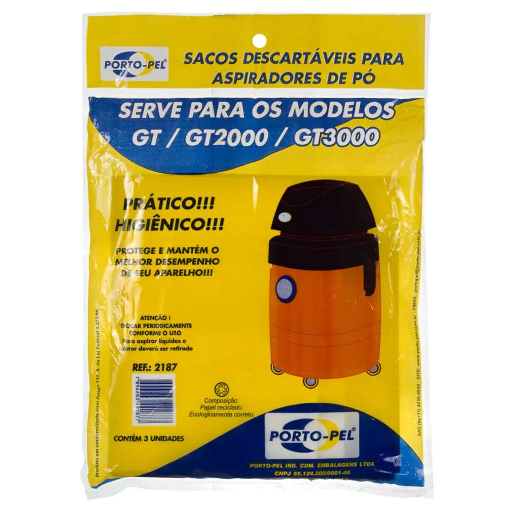 O saco para aspirador de pó GT 3000 Pro da Porto-Pel é um saco descartável que tem 32 centímetros de altura, 0,5 centímetros de largura e 22 centímetros de comprimento, ideal para ser encaixado nos aspiradores de pó do modelo GT 3000. Cada embalagem vem com três unidades do saco para aspirador de pó GT 3000 Pro. Feito de papel, depois que o saco para aspirador ficar cheio dos resíduos recolhidos pelo aparelho na limpeza, deve ser substituído imediatamente por um novo.