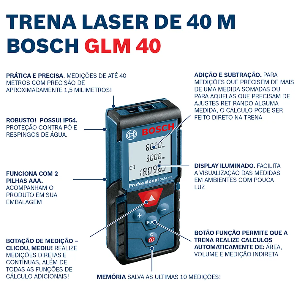 Trena a Laser Cor Vermelha GLM40 Alcance de 40 Metros + Saco Protetor com 2 Pilhas – 0601072900-000 – BOSCH